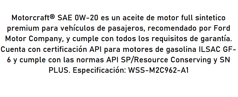 ACEITE 0W20 1LT MOTORCRAFT BENCINERO FULL SYNTHETIC 15.000 KM SN MOTORCRAFT 14425.0 IVA Incluido $ 11702 Precio Neto Stock por sucursal Stock por sucursal cantidad Agregar al carro Avísame cuando llegue