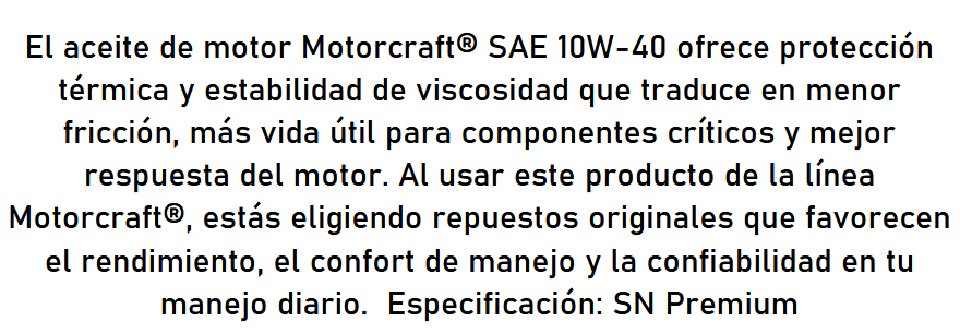 ACEITE 10W40 1 LT Bencinero SEMI-SINTETICO SN PREMIUM 7.000 KM MOTORCRAFT 10735.0 IVA Incluido $ 8601 Precio Neto Stock por sucursal Stock por sucursal cantidad Agregar al carro Avísame cuando llegue
