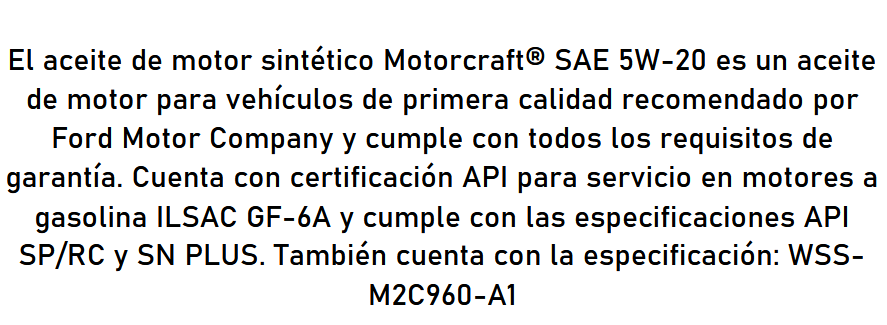 ACEITE 5W20 1 LT BENCINERO FULL SYNTHETIC ILSAC GF-5 , API SN / Energy Conserving - BRSILEÑO MOTORCRAFT 8893.0 IVA Incluido $ 7053 Precio Neto Stock por sucursal Stock por sucursal cantidad Agregar al carro Avísame cuando llegue