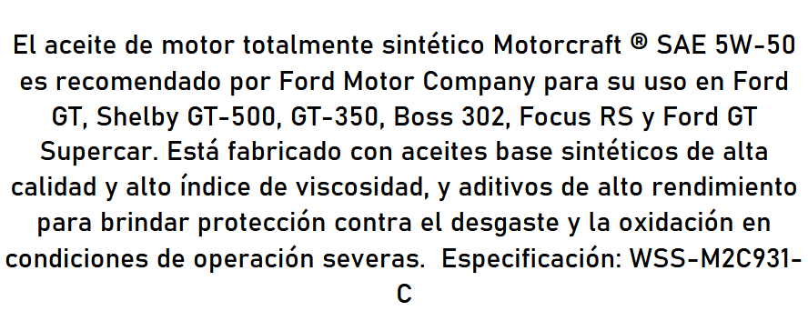 ACEITE 5W50 1 LT MOTORCRAFT Bencinero FULL SYNTHETIC WSS-M2C931-C y cumple con API SN 15000 KM MOTORCRAFT 18737.0 IVA Incluido $ 15325 Precio Neto Stock por sucursal Stock por sucursal cantidad Agregar al carro Avísame cuando llegue